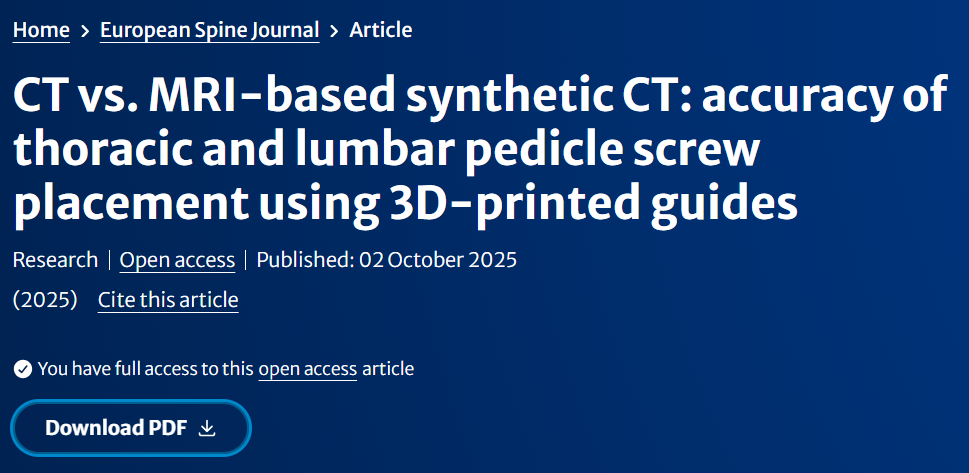 A study recently published in the European Spine Journal evaluated the accuracy of pedicle screw placement in the thoracic and lumbar spine using 3D-printed surgical guides based on either conventional CT images or synthetic CT (sCT) derived from MRI. The study aimed on reducing radiation exposure in surgical planning.